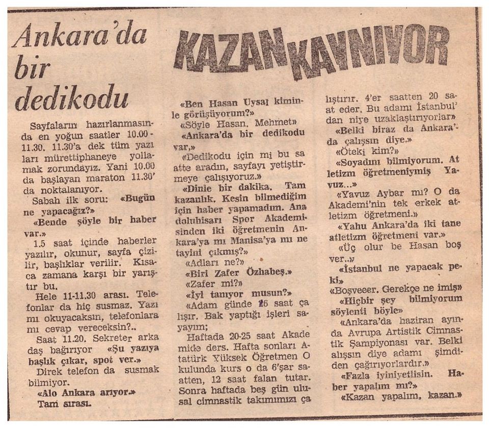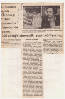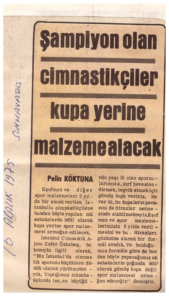 Bu arada Spor salonumuzun olmaması ve eksiklerimi de basına verdiğim demeçlerle dile getiriyor, ilgililerin dikkatini çekmeye çalışıyordum. Son Havadis gazetesinden Pelin Köktuna ilk demecimi yayınladı. Bu demecimde salon, alet, malzeme, yetersizliğinden bahsediyor, yarışma azlığı, sporcu sayısı azlığı , gibi konuları dile getirerek, küçüklere yönelik çalışmaların çok daha kapsamlı olması gerketiğini vurguluyorum.