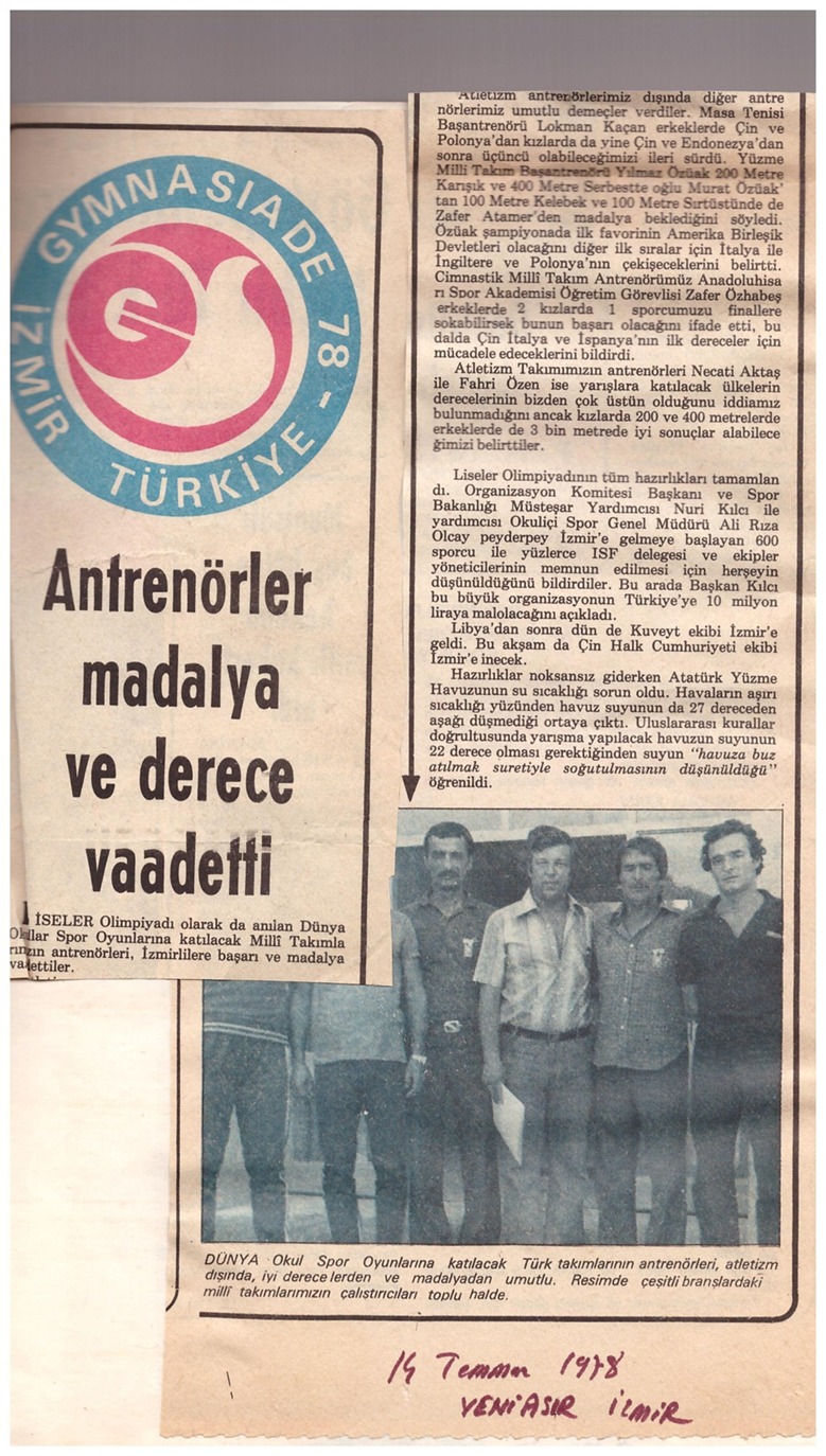 14 Temmuz 1978 Dünya liseler arası cimnastik yarışmaları kısa adı ISF , izmirde yapıldı. Takım antrenörlüğünü yaptığım yarışmalarda Cengiz ÜNVER atlama beygirinde finale kaldı..