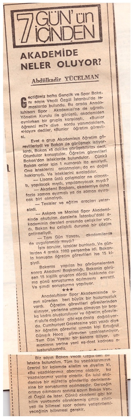 herşeyimize engel oldu, bu tatsızlıklar ankaraya Gençlik ve spor Bakanı Vecdi GÖNÜL’ e kadar gitti. Sonunda Bakan İstanbula Akademiye geldi, yönetim ile ve bizimle görüştü, gittİ. Ancak isteklerimizi çok kısa sürede dinleyen Bakan 4 kişi yani dört akademisyen hakkında soruşturma açılması emri verdi ve ankaraya döndü, bu durumda gazetelik oldu.