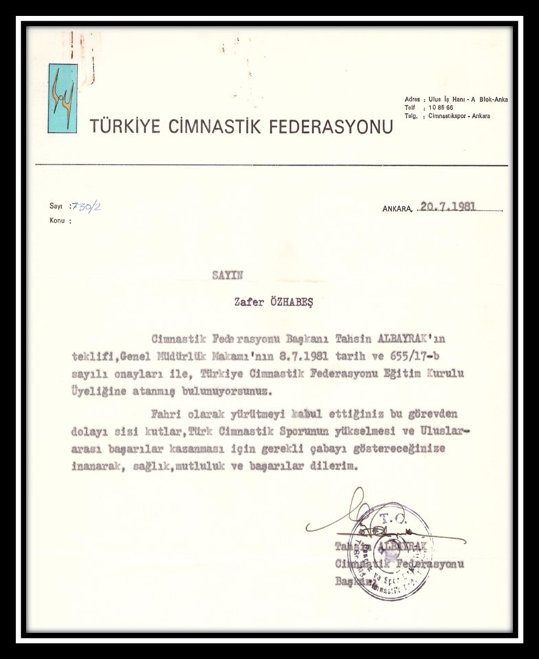 20.07.1981 tarihinde Resmi yazı ile Tahsin ALBAYRAK tarafından Federasyon Eğitim kurulu uyeliği görevine getirildim.